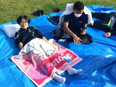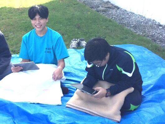 10月7日(火)、音楽の授業では、校舎前の芝生で音楽鑑賞を行いました。快晴で心地よい秋風が吹く中、生徒たちはブルーシートの上に寝転んだり、布団にくるまったりしながら音楽を聴いて、穏やかな時間を過ごしました。