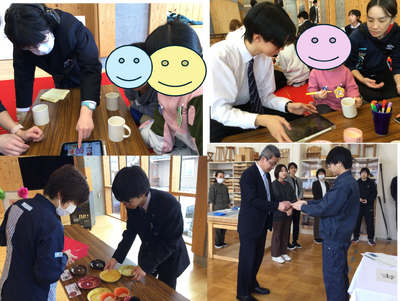 3月13日(金)小平町多目的防災交流施設「群来(くき)る」の1階ホールにて、「年度末販売会」を実施しました。本校窯業科1・2学年の生徒が主体となり準備を進め、会場にはお皿やカップなど200点ほどの製品が並びました。また、白いマグカップにお絵かきができる「絵付け体験」ブースも設け、鬼鹿幼稚園の園児をはじめ、たくさんの方に体験していただきました。