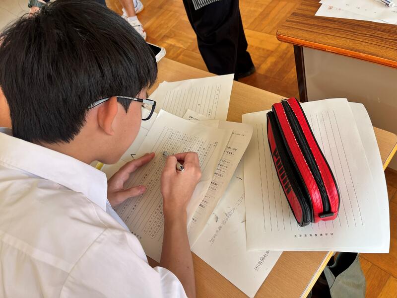 1学年の現場実習の目的である『知る』をテーマに、働くことだけではなく、地域の事業所の方々のおかげで、自身の課題や自分が得意なことを知り、働くことのやりがいや大変さなど様々な思いを感じることができました。 生徒たちは、現場実習中に教えていただいたこと、今後の学校生活へ生かしていきたいことなど感謝の気持ちを込めて、一文字ずつ丁寧に書く様子が見られました。