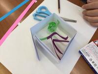 11センチ四方の枠の中に、色画用紙の帯を折ったり切ったり丸めたりしながら自由に装飾していきます。